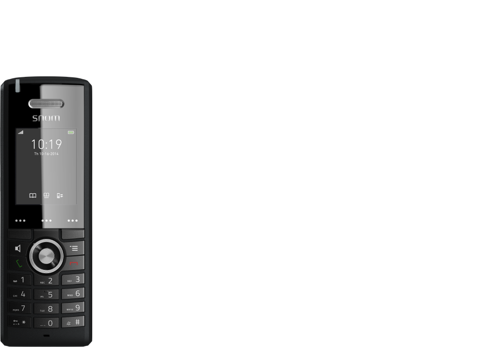 In Kombination mit der Snom M400/M900 Basis bietet das M65 außerdem eine Vielzahl komfortabler Telefonie-Funktionen wie Makeln, Konferenz, Anruferlisten oder direkten Zugriff auf ein Firmen-Telefonbuch.