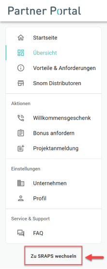 As a Snom partner, it is particularly easy to add an SRAPS account to your partner account from the partner portal. To get an SRAPS account, simply click on the link "Switch to SRAPS" on the bottom left.