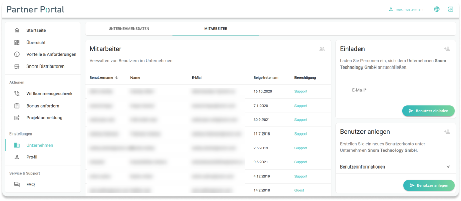 The Partner Portal offers the possibility to create several employees of a company and to give them access to certain functions. You can either invite employees or create colleagues yourself. It is important to note that the first user is always the administrator* / manager of the company.