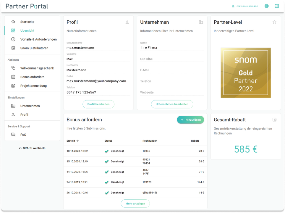 In your personalised Snom Partner Program dashboard you will find all important information about your,