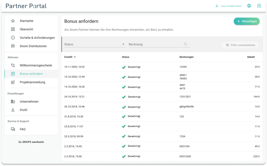 An important part of the Snom Partner Programme is to refund money for purchased Snom devices in the Silver and Gold level partners. All you need to do is upload invoices for the purchase.