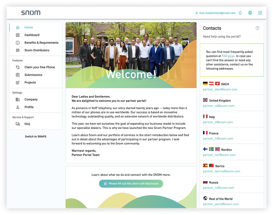 After your registration in the Snom Partner Portal and the activation by Snom you get access to our portal. From now on you can use all helpful functions of the portal and get access to our discounts and downloads depending on your partner level.