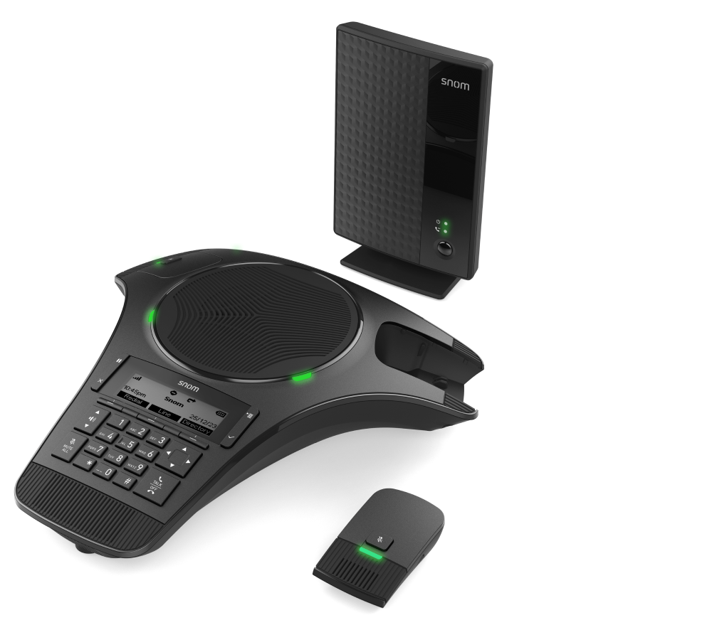 The Snom C620 is a cordless DECT conference phone that puts an end to tangled cables on and under the conference table! The system includes a SIP DECT base station and a docking station to charge the device for up to 24 hours of talk time (12 hours of wideband audio). The integrated microphones are also wireless and can be used freely across the meeting table. The two wireless microphones are simply charged via the integrated charging slots.