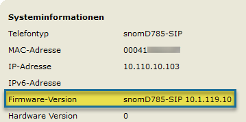 The firmware version is displayed in the last line after the User Agent, in the example snomD785-SIP: 10.1.119.10